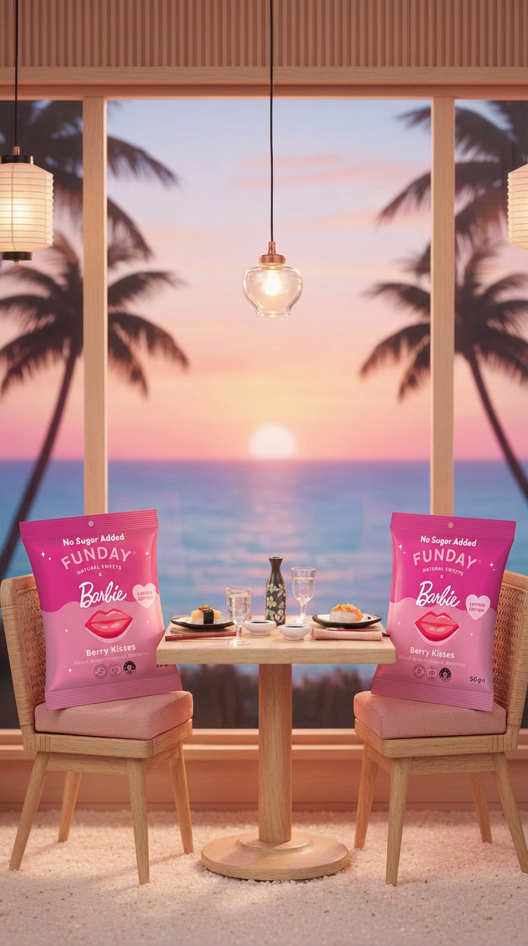 AI-composited social video produced for the FUNDAY x Barbie Malibu Trip Giveaway, bringing each prize element to life visually using generative AI. Posted to the FUNDAY Sweets Instagram.